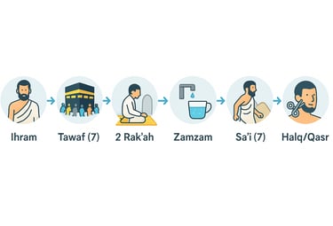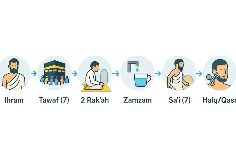 A complete walkthrough of Umrah rituals — from Miqat to Halq/Qasr — explained clearly for first-time and repeat pilgrims.